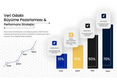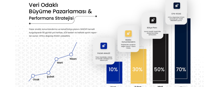 Pazarlama bütçeniz bir kara delik olmasın. "Acaba tutar mı?" diye düşünmek yerine, veriye dayalı kararlar alıyoruz. Pazar analizi, marka konumlandırma ve bütçe planlamasını OKR ve KPI temelli kurguluyor; markanız için belirsizliği ortadan kaldırıyoruz. Hedefimiz net: CPA’yı (Maliyet) düşürmek, ROAS’ı (Getiri) zirveye taşımak.