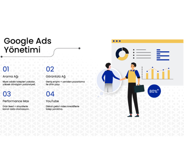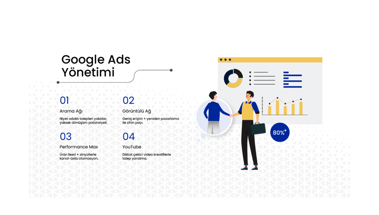 Reklam bütçenizi deneme yanılma yöntemleriyle harcamayın. Sizin için Arama, Görüntülü, Performance Max ve YouTube kampanyalarınızı en akıllı şekilde kurguluyoruz. Hedefimiz net: Daha az maliyetle daha çok görünürlük, daha fazla satış ve dolup taşan bir randevu takvimi. İşin teknik kısmını biz halledelim, siz büyümeye odaklanın.