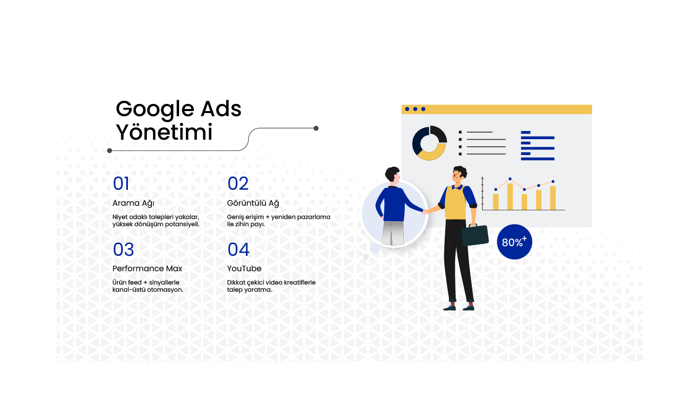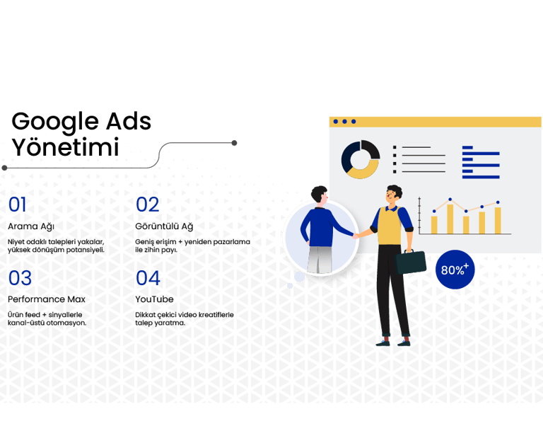 Reklam bütçenizi deneme yanılma yöntemleriyle harcamayın. Sizin için Arama, Görüntülü, Performance Max ve YouTube kampanyalarınızı en akıllı şekilde kurguluyoruz. Hedefimiz net: Daha az maliyetle daha çok görünürlük, daha fazla satış ve dolup taşan bir randevu takvimi. İşin teknik kısmını biz halledelim, siz büyümeye odaklanın.