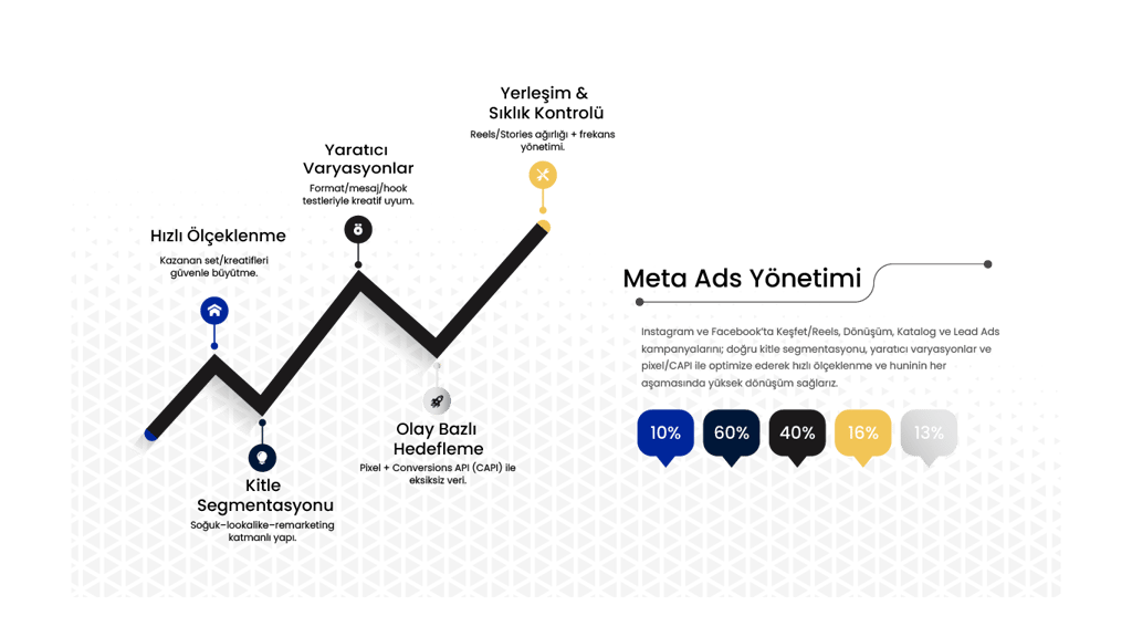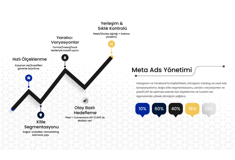 Keşfet–Reels, Dönüşüm, Katalog ve Lead Ads kampanyalarınızı akıllı segmentasyon ve pixel/CAPI ile optimize eder; hızla ölçekler, tüm kitle ısınmalarında dönüşümü artırırız.