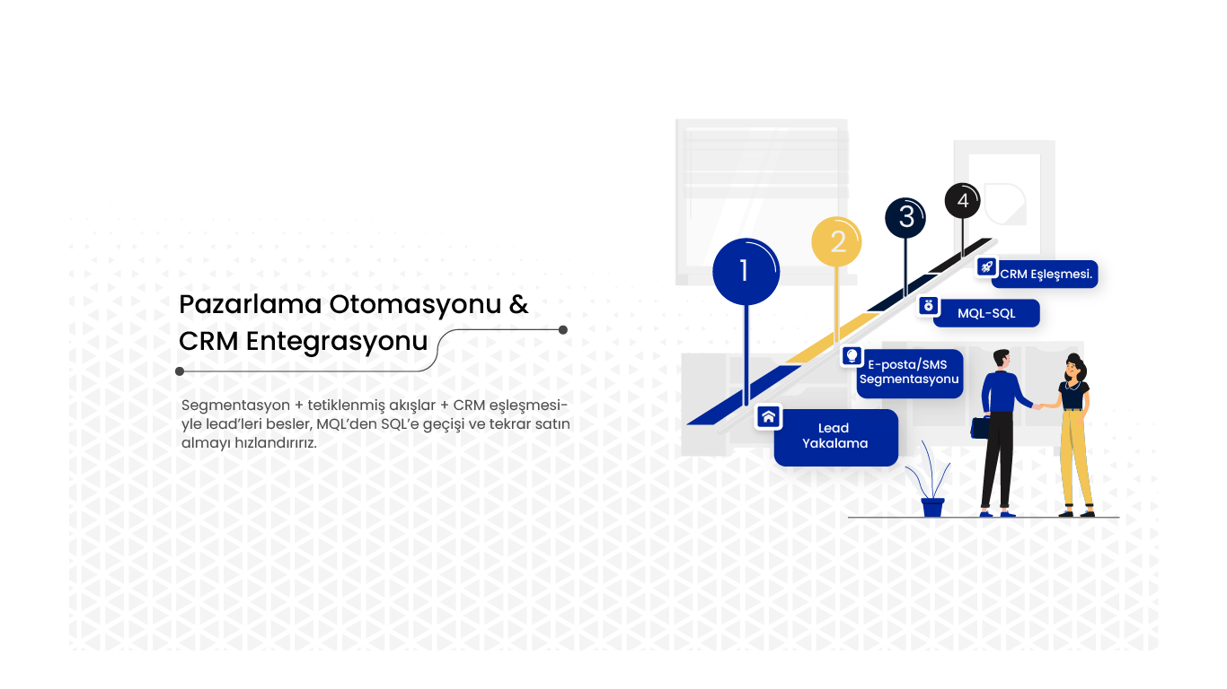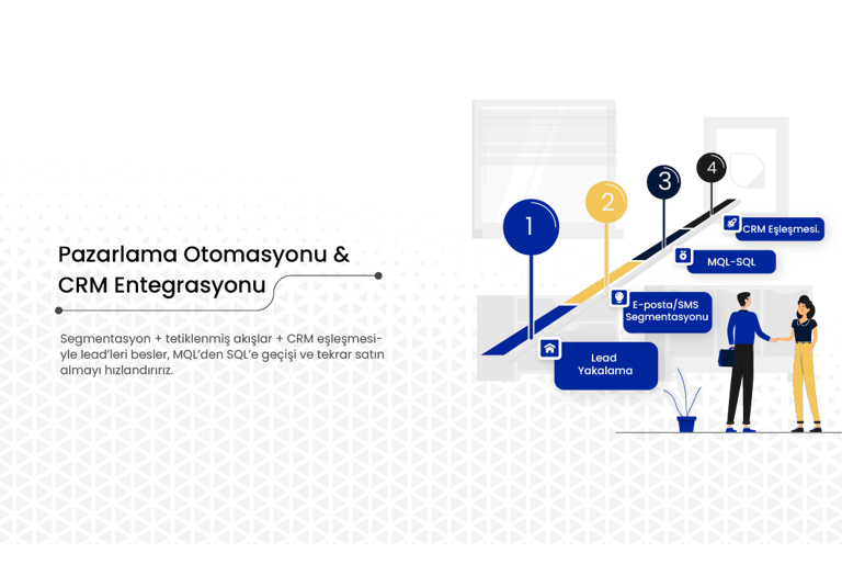 Segmentasyon + tetiklenmiş akışlar + CRM eşleşmesiyle lead’leri besler, MQL’den SQL’e geçişi ve tekrar satın almayı hızlandırırız.