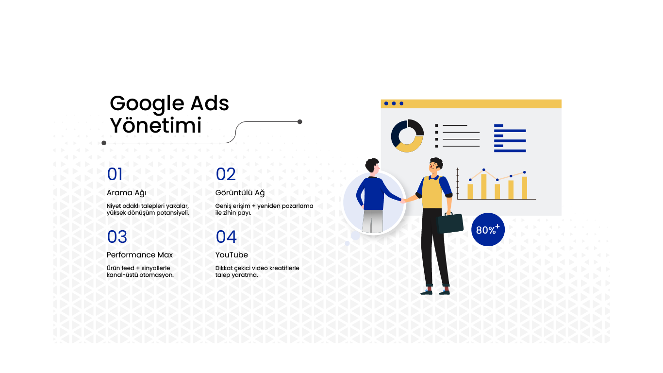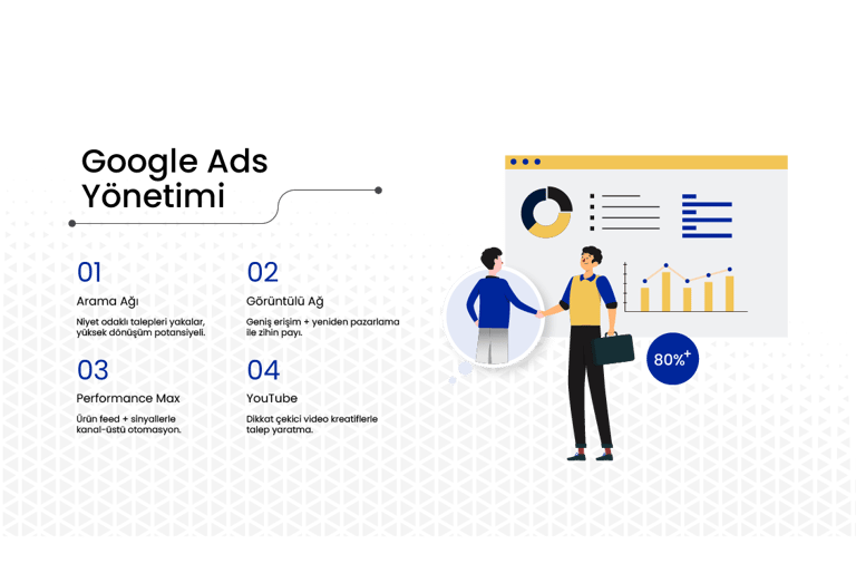 Arama, Görüntülü, PMax ve YouTube kampanyalarınızı akıllı yapı ve izlemeyle optimize eder; görünürlüğü artırıp maliyeti düşürür, satış ve randevuları yükseltiriz.