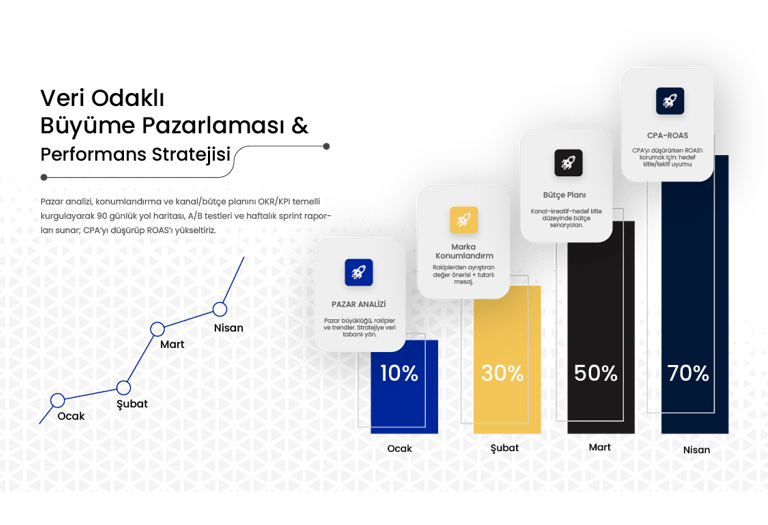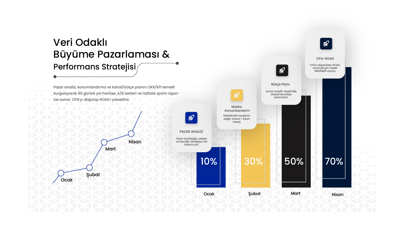 Pazar analizi, konumlandırma ve kanal/bütçe planını OKR/KPI temelli kurgulayarak 90 günlük yol haritası, A/B testleri ve haftalık sprint raporları sunar; CPA’yı düşürüp ROAS’ı yükseltiriz.
