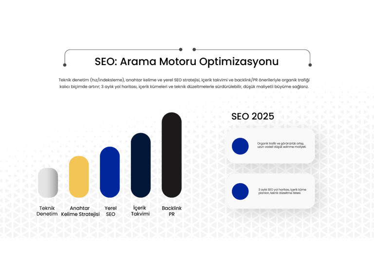 Teknik + içerik + otorite odaklı SEO ile yerel/organik görünürlüğünüzü kalıcı biçimde artırır; 3 aylık yol haritası, içerik kümeleri ve teknik düzeltmelerle sürdürülebilir, düşük maliyetli büyüme sağlarız.